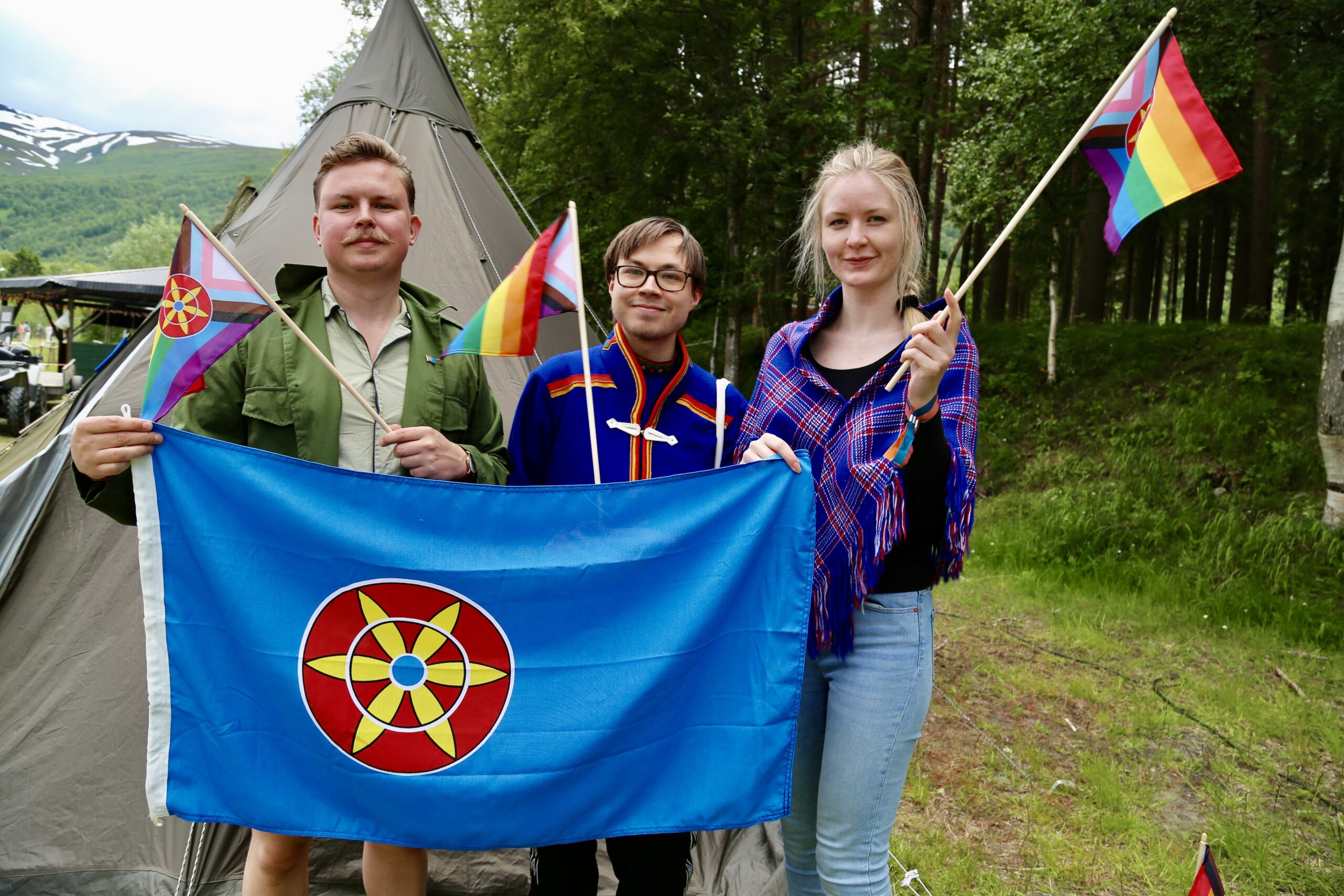 Henrik Madsen (f.v.), Daniel Tobias Johansen Langhoff og Sofie Kampen var fargerike innslag på festivalsletta i Manndalen i sommer. (Kuva: Kjærstin Berntzen)