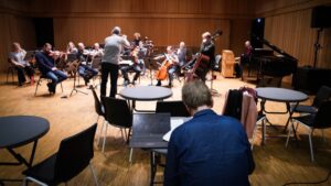 Fra workshop med komponistene i Open Call i 2024. Musikken spilles og jobbes med under ledelse av Arktisk FIlharmonis Sinfonietta sin kunstneriske partner, Tim Weiss. På dette bildet jobbes det med verket til komponist Vegard Guleng. Foto: Aggie Peterson