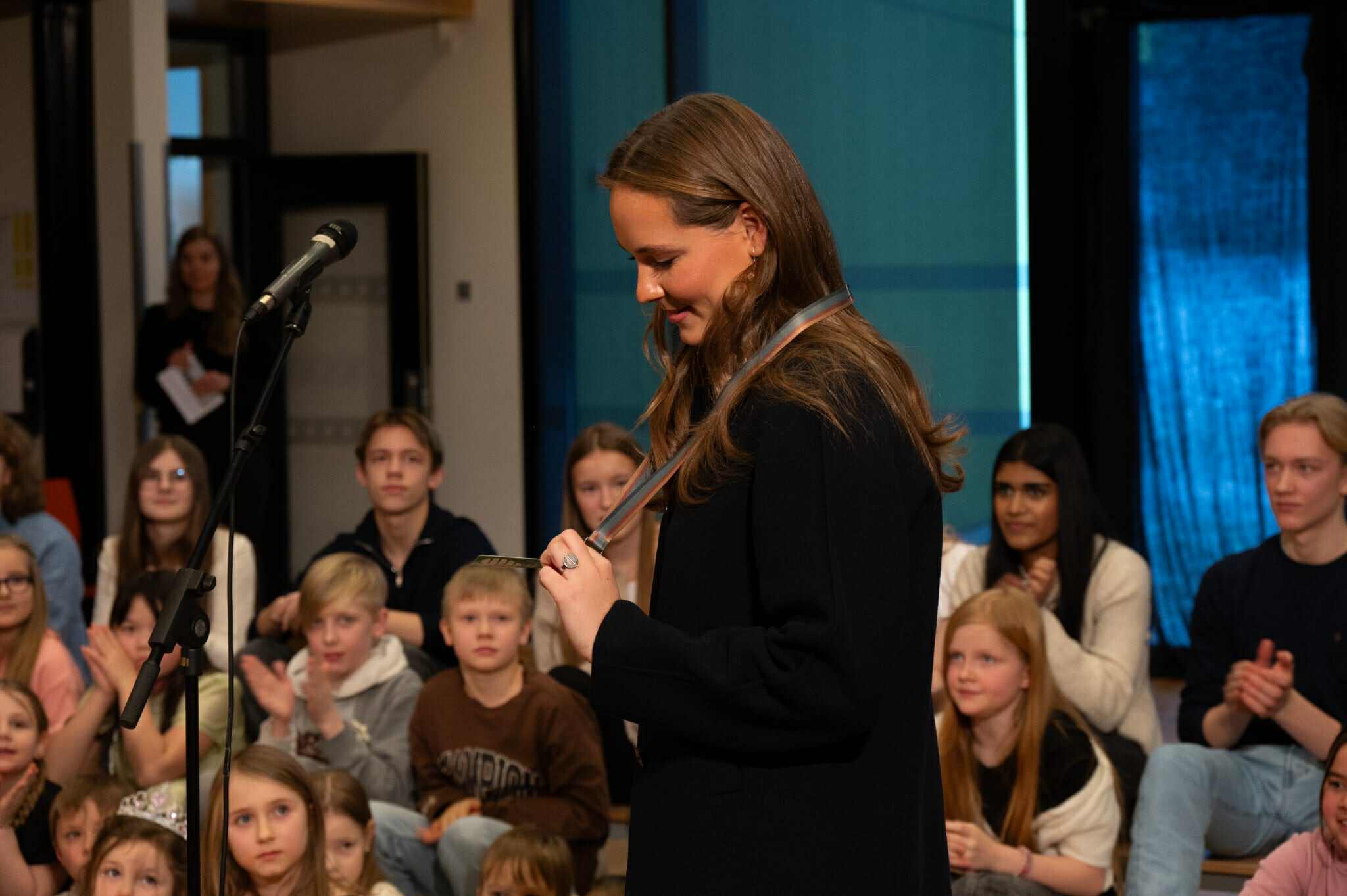 Prinsesse Ingrid Alexandra med det grønne kortet om halsen. (Kuva: Kirkenes skole)