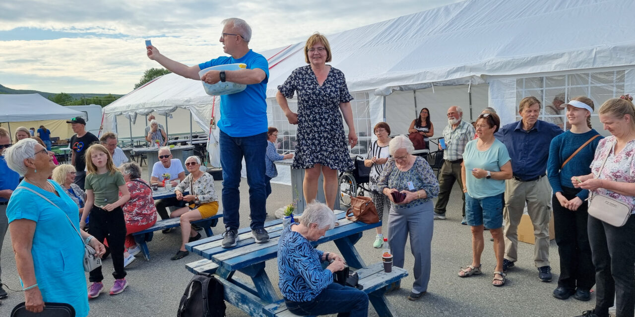 Tidligere festivalsjef Egil Borch hjalp nåværende sjef Sølvi Johansen. Nemlig med loddtrekningen under Kipparifestivalen 2024. • Entinen festivaalipäälikkö Egil Borch auttoi uutta päälikköö, Sølvi Johansennii. Nimittäin arpomisessa vuođen 2024 Kipparifestivaalin aikana. (Kuva: Arne Hauge)