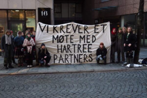 – Vi er her for å kreve dialog med Hartree Partners, noe de har nektet oss i månedsvis. De finansierer ødeleggelsen av en nasjonal laksefjord og raseringen av dyrebart reinbeiteland. Det er en uetisk og historisk dårlig investering, sier Hætta Isaksen.