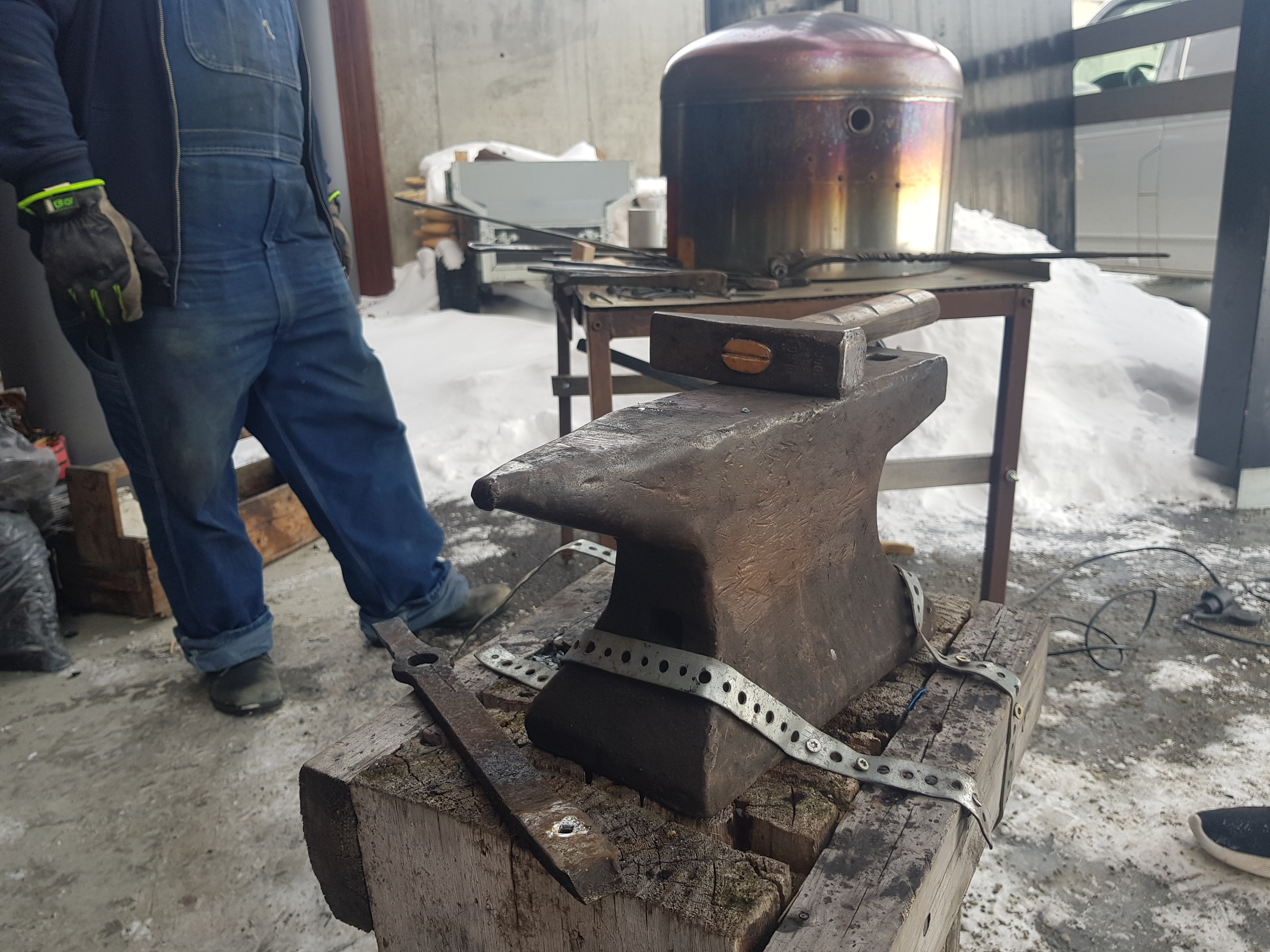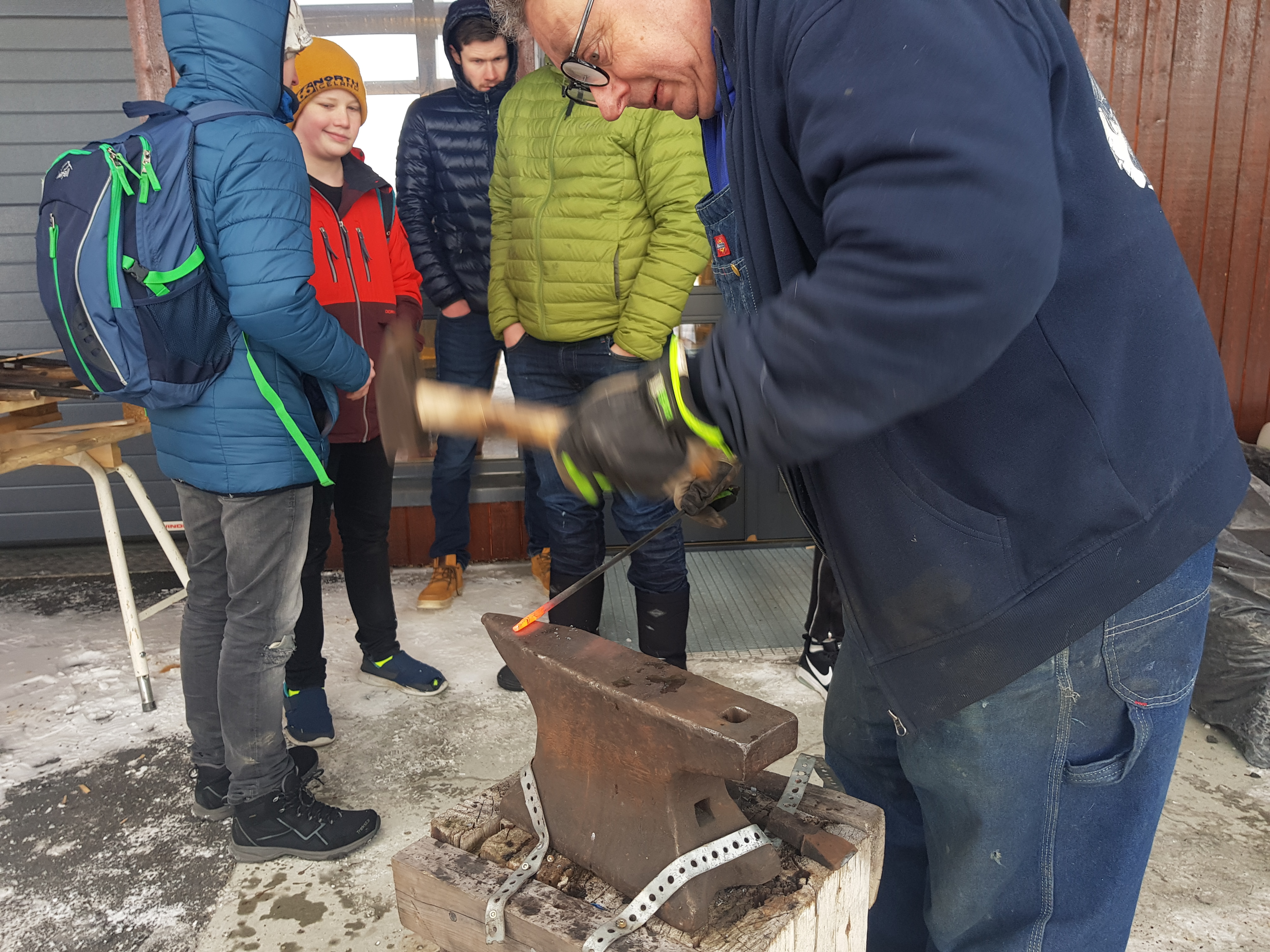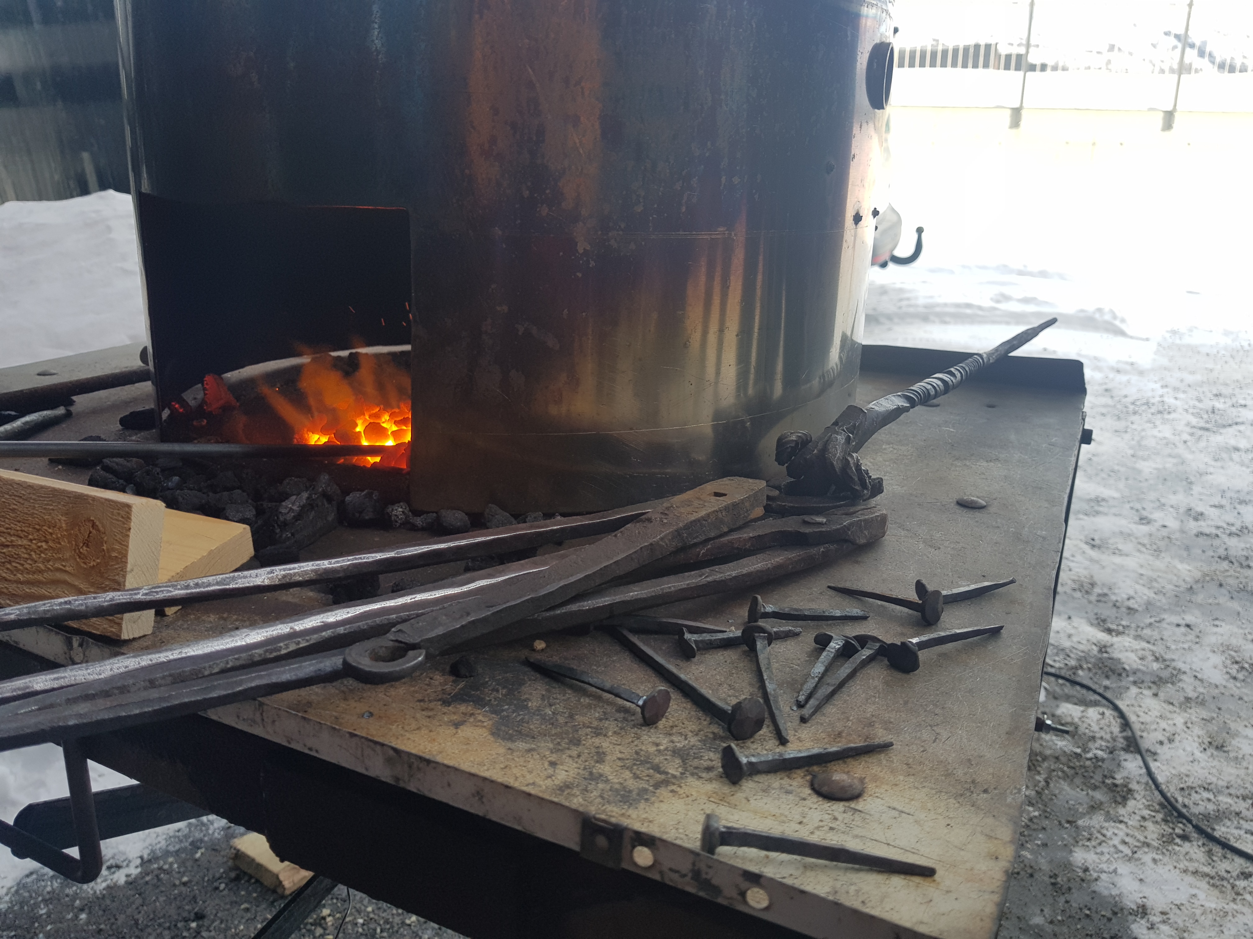 - Onsdag 13. mars hadde Nord-Troms Museums håndverker og smed, Hans-Erik Olsen, demonstrasjon av smiing og smiteknikker utenfor Halti i et opplegg for ungdomsskoleelever, med sin mobile smie som han hadde med. Kuva: Pål Vegard Eriksen, Haltiin kväänisentteri