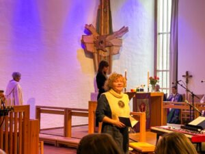 Kvenfolkets leder Kristin Mellem synger «Jo attelen» under Kirkemøtets åpningsgudstjeneste. (Foto: Rune Sundelin/NKF-RK)