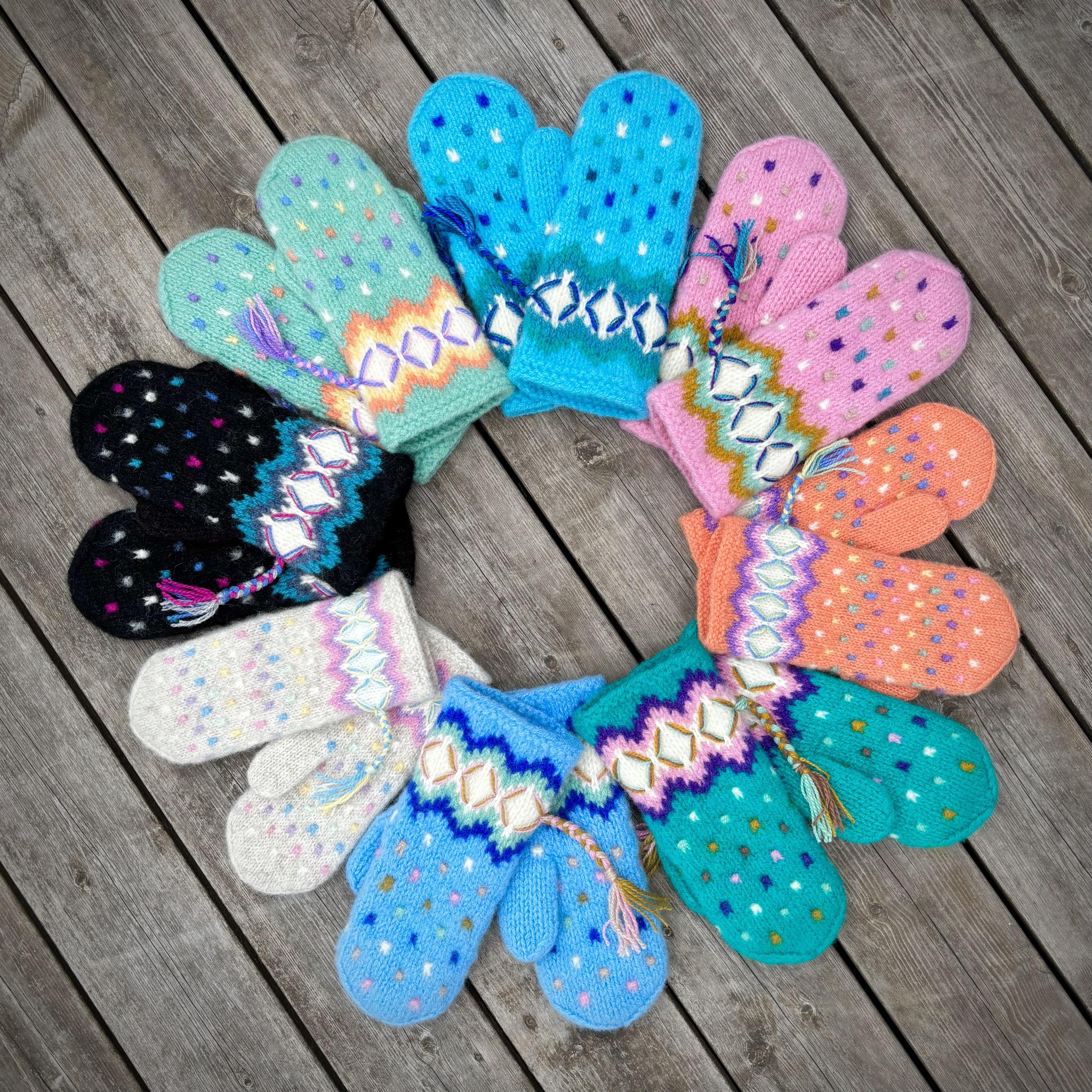 Alle tre drømmevottene har Lovikka-inspirert dekor med dusk på mansjettene, men uttrykket er bevisst moderne.