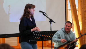 Bildet er fra jubileet til Kvensk institutt nå i år. Amelia fikk mye applaus da hun sang Bøgda vår. Med seg på gitar på scenen hadde hun Sigbjørn Sarre. (Foto: Maureen Bjerkan Olsen)