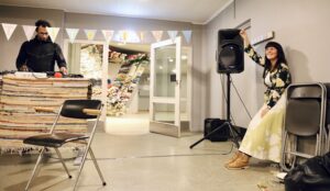 Det nye navnet ble presentert på en svært sjarmerende måte, gjennom samtale, musikk og høytidelig heising av et banner. Her ser vi DJ Fred Eine og kunstner Emilie Solheim. (Kuva: Kjærstin Berntzen)
