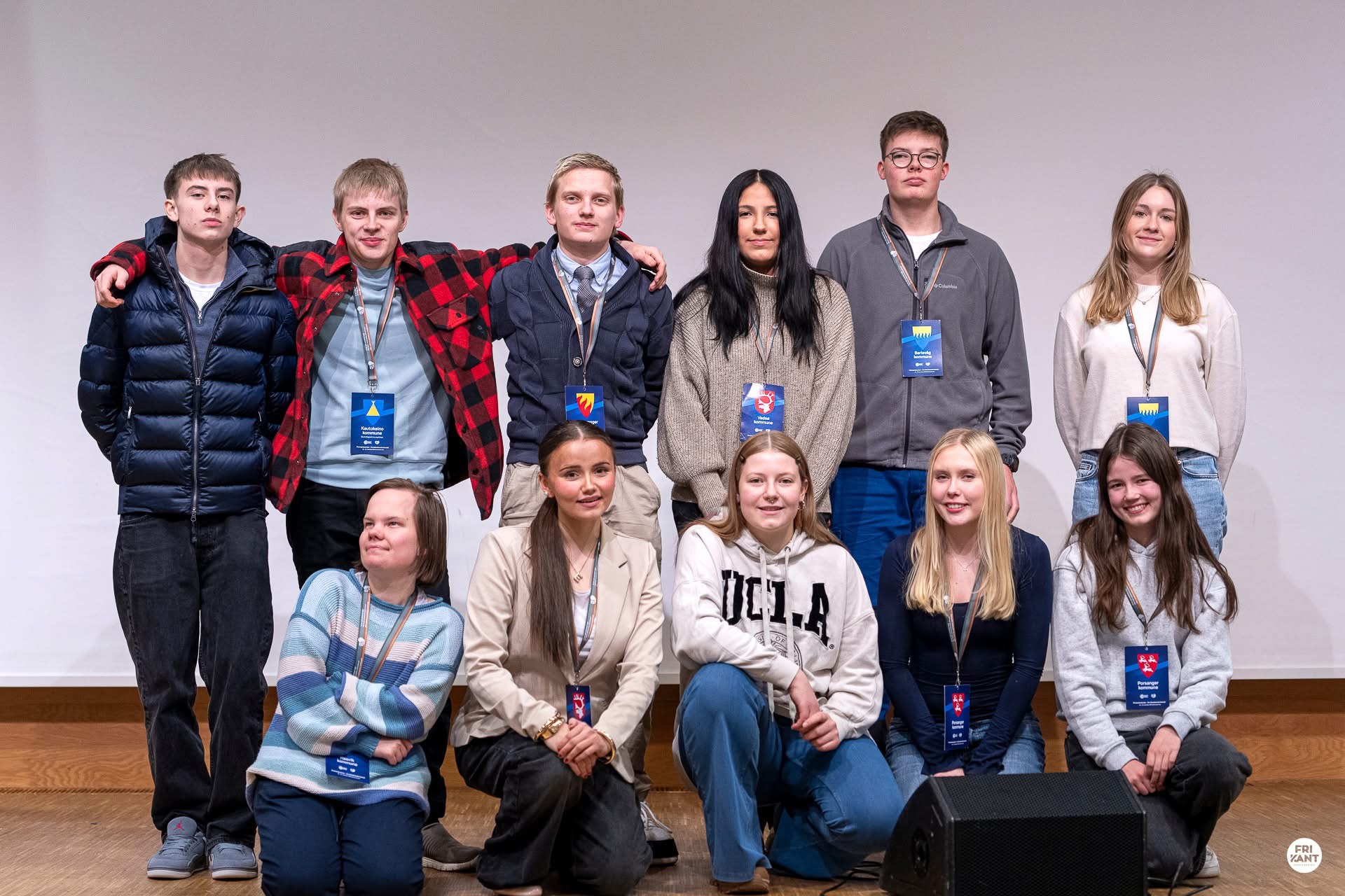 Ungdom på scenen under Finnmarksverten, en vertskapskonferanse fotballkretsen hadde i slutten av november 2025, hvor alle kommunene i Finnmark var representert og fikk inspirasjon til hvordan få folk til å komme til seg, trives og bli. (Kuva: Frikant/Frank Rune Isaksen)