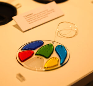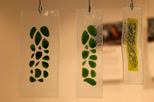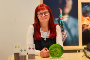 – Minun työ oon klasityö. Ja emaljien kans. Ennemin smykkin ja semmosia. Ja sitten minun klasityö oon – miten mie sanoin sen meänkieleksi – faatia ja semmosia. Ja sitten semmosta mitä saataa hengitaa klasista, ja niin poispain.
