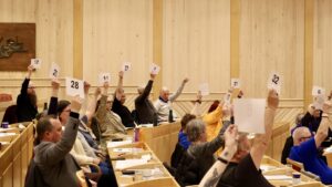 Valget mellom de to lederkandidatene ble gjennomført som skriftlig avstemming blant de 40 stemmeberettigede medlemmene som var til stede. (Kuva: Kjærstin Berntzen)