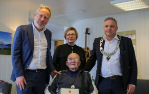 Her ser vi assisterende riksantikvar Audun Skeidsvoll, seksjonsleder kulturarv i Troms fylkeskommune Monica Dahl og Lyngen-ordfører Eirik Larsen, sammen med Hans Sigfred Lundvoll. (Kuva: Pål Vegard Eriksen)