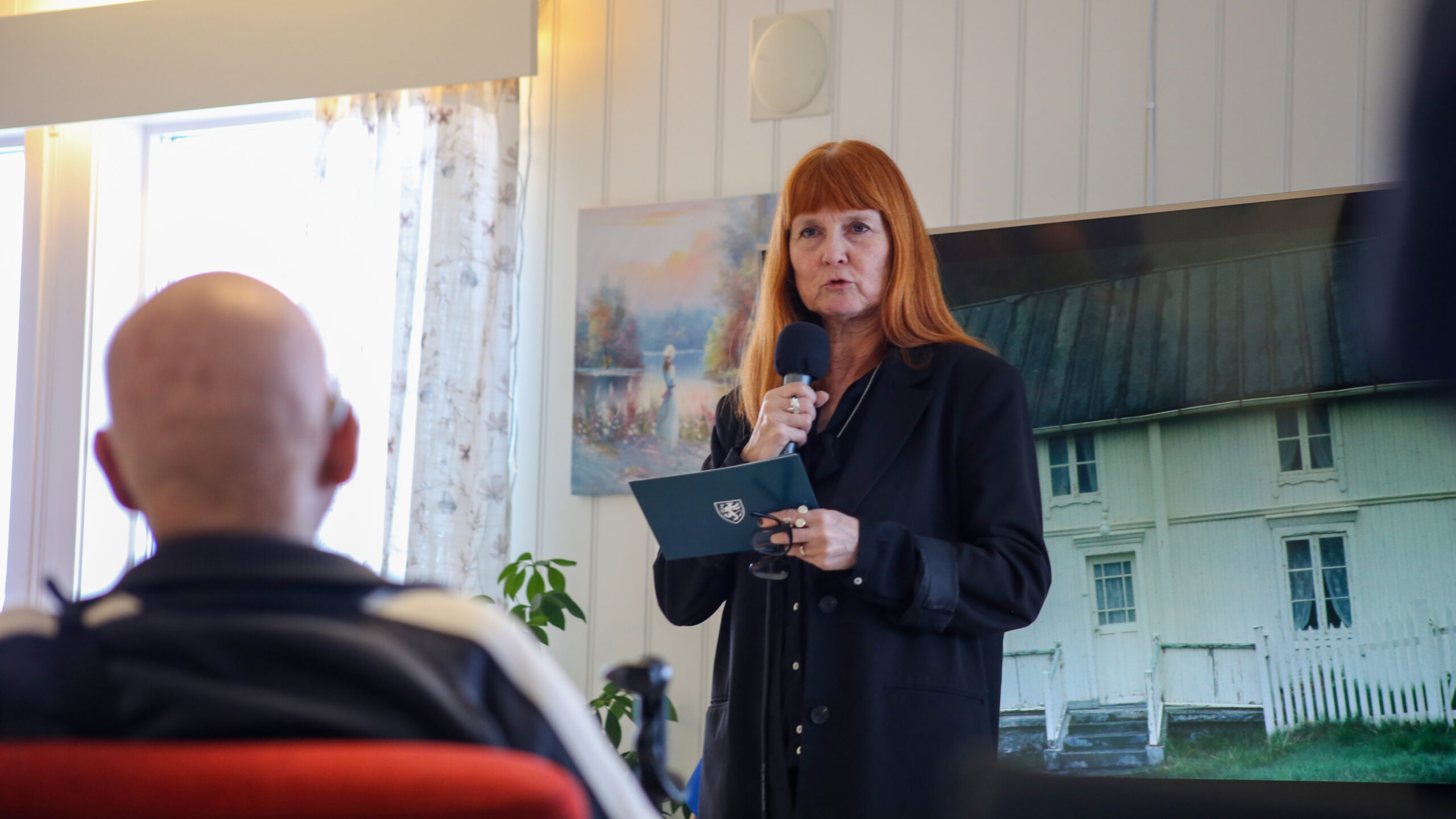 Eirin Britt Gjelsås fortalte litt om den mangeårige prosessen inn mot fredningen av Nedrum gård, med eier Hans Sigfred Lundvoll (95) som fremste tilhører. (Kuva: Pål Vegard Eriksen)
