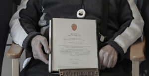 De gamle arbeidsnevene med den kvenskspråklige diplomet i hånd. (Kuva: Pål Vegard Eriksen)