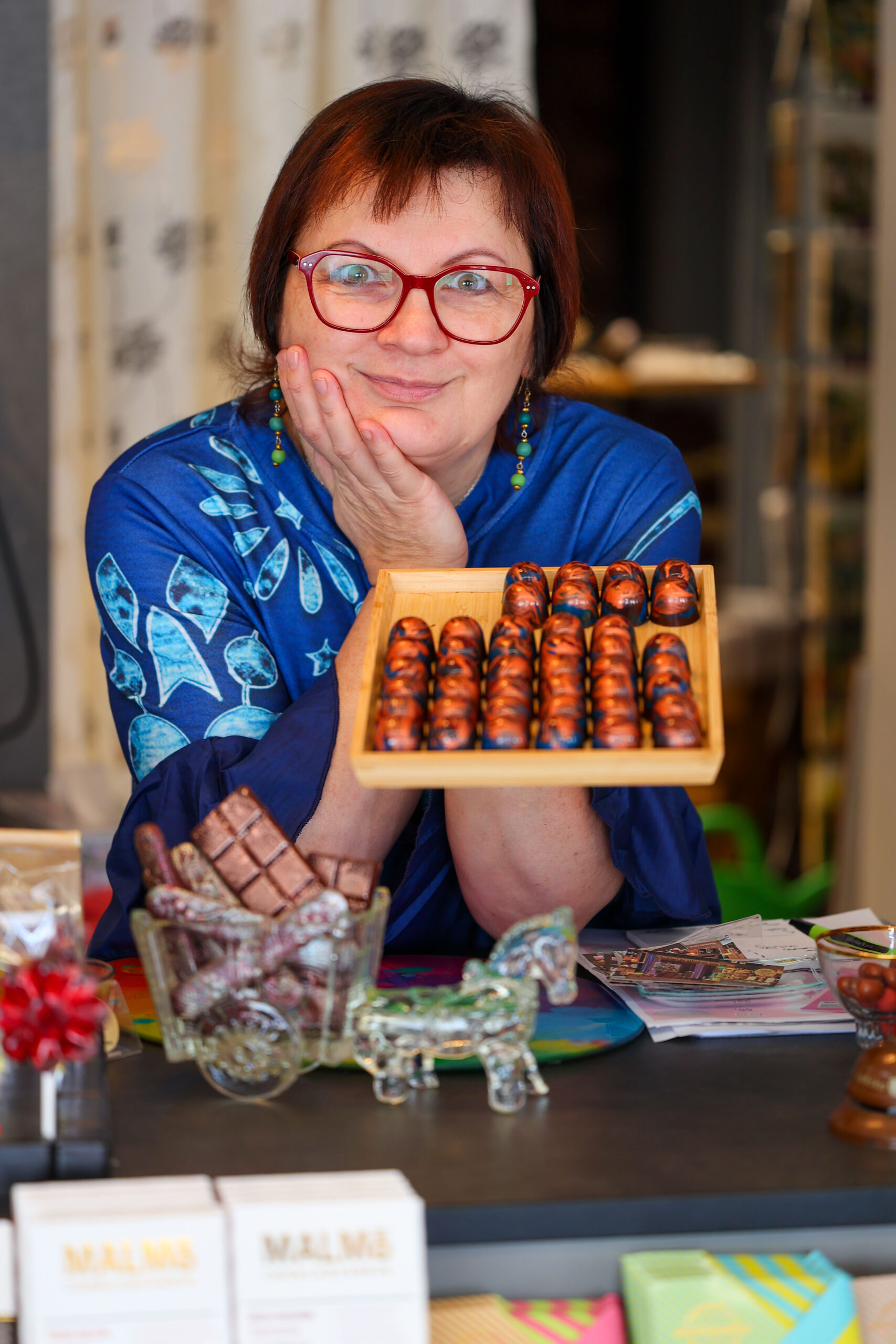 – Jeg tilvirker også en del sjokoladekaker og andre produkter, men aller mest går det i praliner. De er alle artisan, altså ekte håndverk. Både håndlagete og håndmalte, sier Pavlina, hun er selvlært chocolatier og gründer av «Sweet treats by Pavli.»
