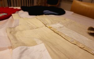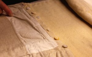 Det er lett å se at vesten har blitt lappet, og for sømkyndige øyne er det synlig at den har blitt tilpasset og endret gjennom at innsnitt er sprettet opp, og at det er satt inn kiler.