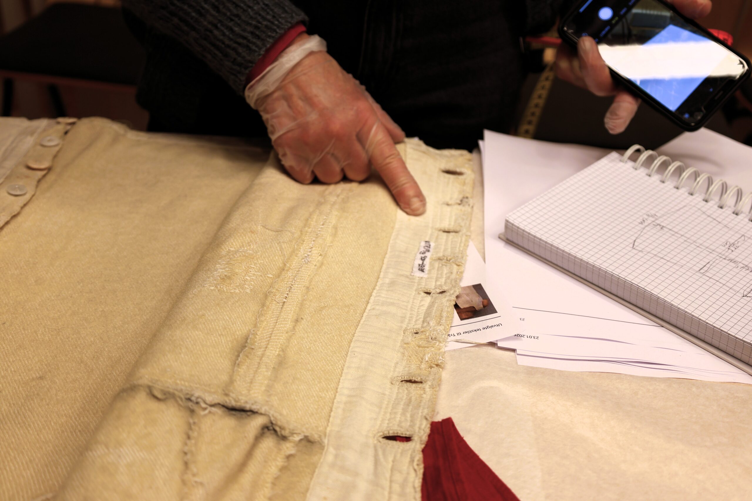 Gro Lisbeth Eriksen måler opp og undersøker plagget nøye. (Kuva: Kjærstin Berntzen)
