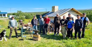 Fra et smiekurs i Pyssyjoki/Børselv i 2023. Fra venstre ser vi Inferno og Raymond Olufsen fra Vadsø, Herulf Johansen fra Holmestrand, Arild Nyberg fra Leirpollen, Joakim Storslett fra Trøndelag, Steve Aslaksen fra Kokelv sjøsamiske museum, smed og kursleder Hans Erik Olsen fra Perteng, Bror Ivar Salamonsen fra Karasjok, Riinakaisa Laitila fra Lakselv, Sverre Josefsen fra Mårnes (bosatt i Børselv) og Gunnar Grønvold fra Karasjok. (Kuva: Arne Hauge)