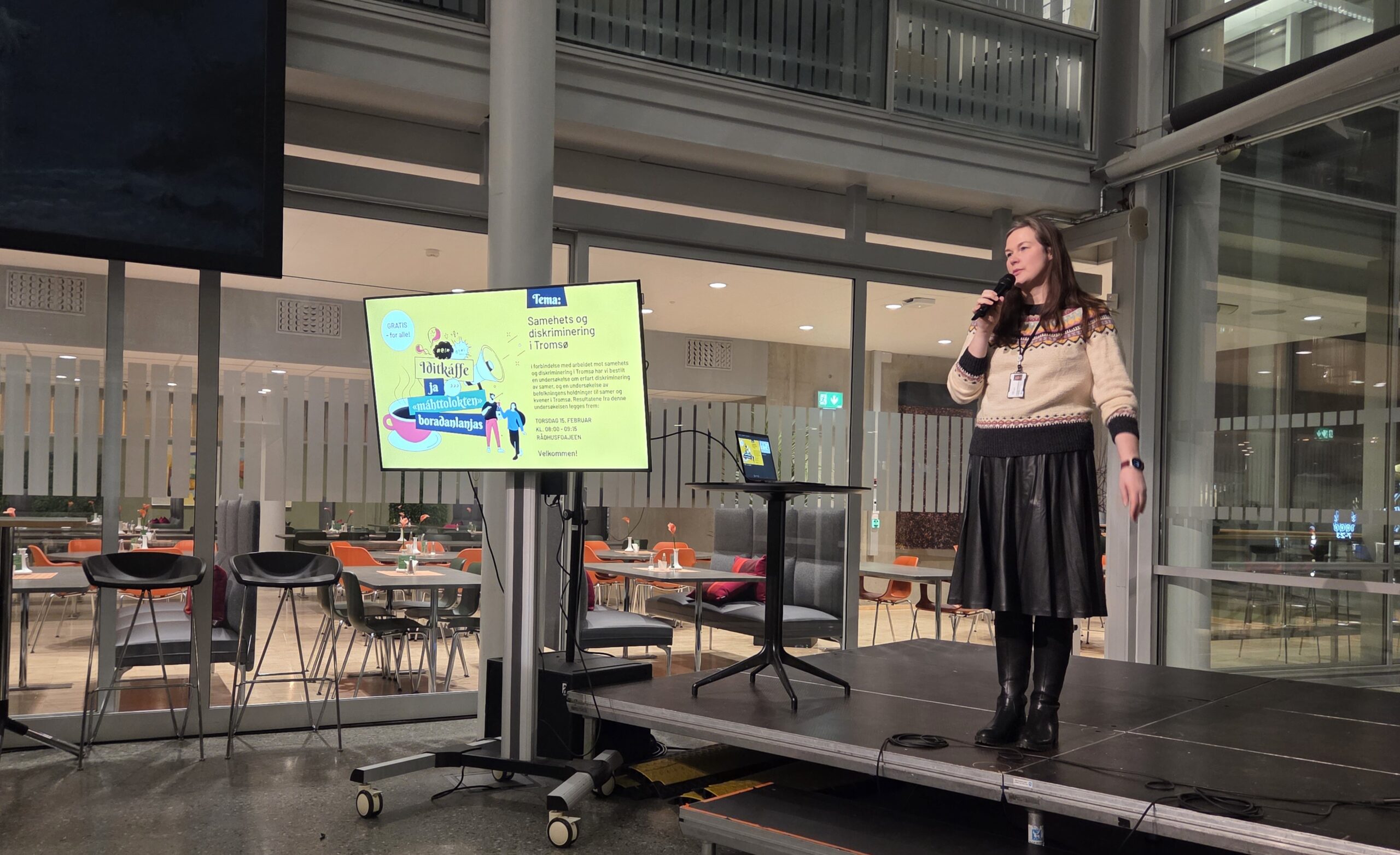 Nylig ble resultatene fra en ny undersøkelse om rasisme og diskriminering av kvener og samer lagt fram under et arrangement i Rådhusfoajeen i Tromsø. Her står Myhre på scenen under presentasjonen. (Kuva: Bernt Isaksen)