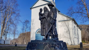 Rallarfamilien utenfor Kåfjord kirke i Alta. (Illustrašuunikuva: Pål Vegard Eriksen)