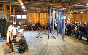 På programmet sto også en «motemolo», der Vårhild Bakke Berntsen viste fram klær inspirert av skogfinsk kultur. I bakgrunnen sees kunstverket Vastavirthaan // Motstrøms, laget av M. Seppola Simensen, Elisabeth Seppola Simensen og Maiya Syrstad Jerijervi. (Foto: Privat/Rune Jørgensen)