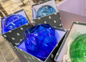 Hun viser ogs fram fire andre nyheter i butikken: tre glasskuler formet som gamle glasskavler, slik fiskerne brukte før.