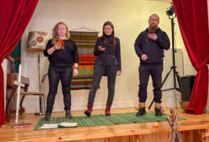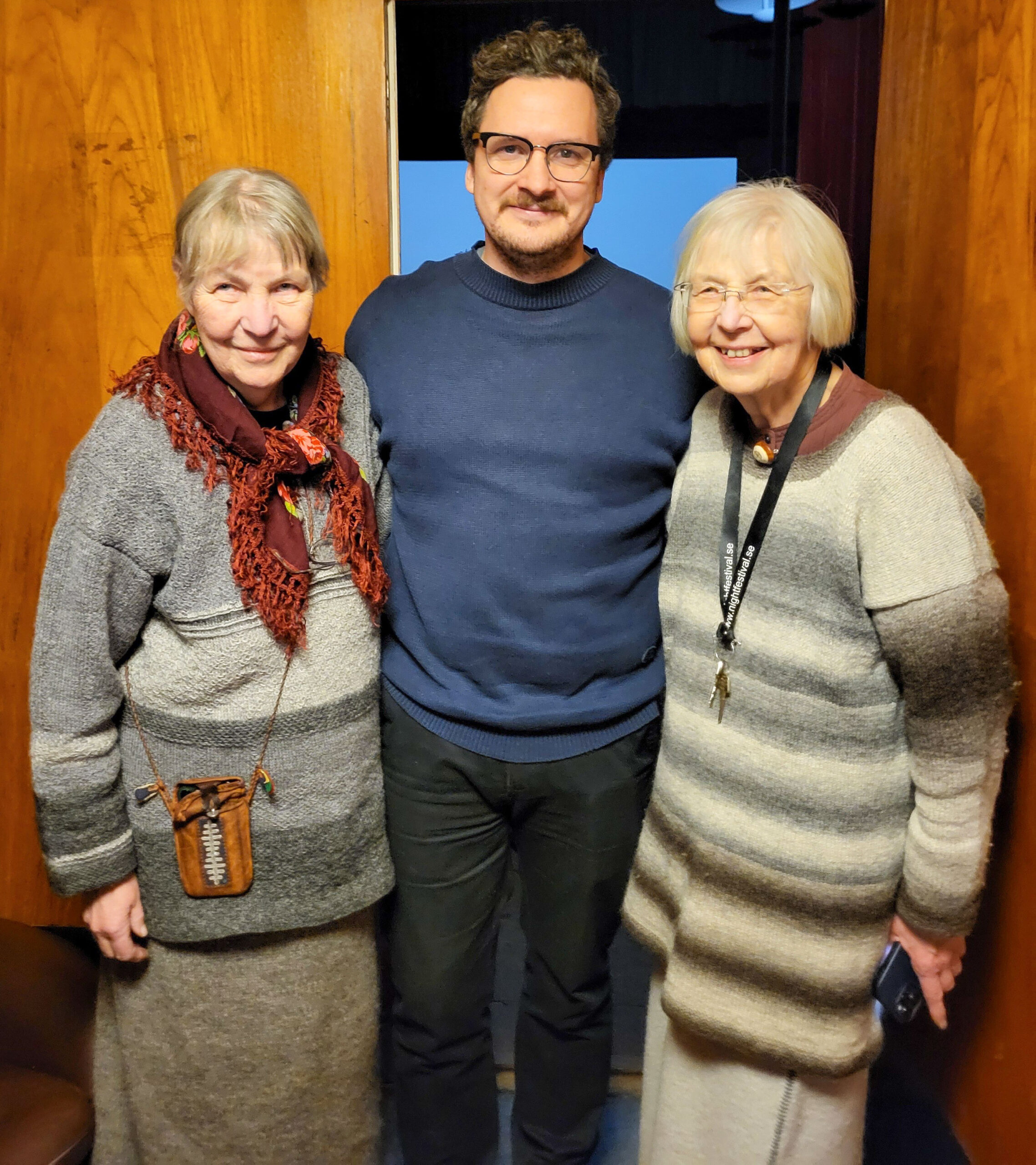 Sebastian Brännvall lager film om søstrene Nylund. I filmen møter vi alle tre, og det er sterkt og fint å se Karin som gikk bort i fjor. Både Märta, Linnea og publikum virker fornøyde med det foreløpige resultatet. (Foto: Katja Herkönen, Filmpool Nord.)