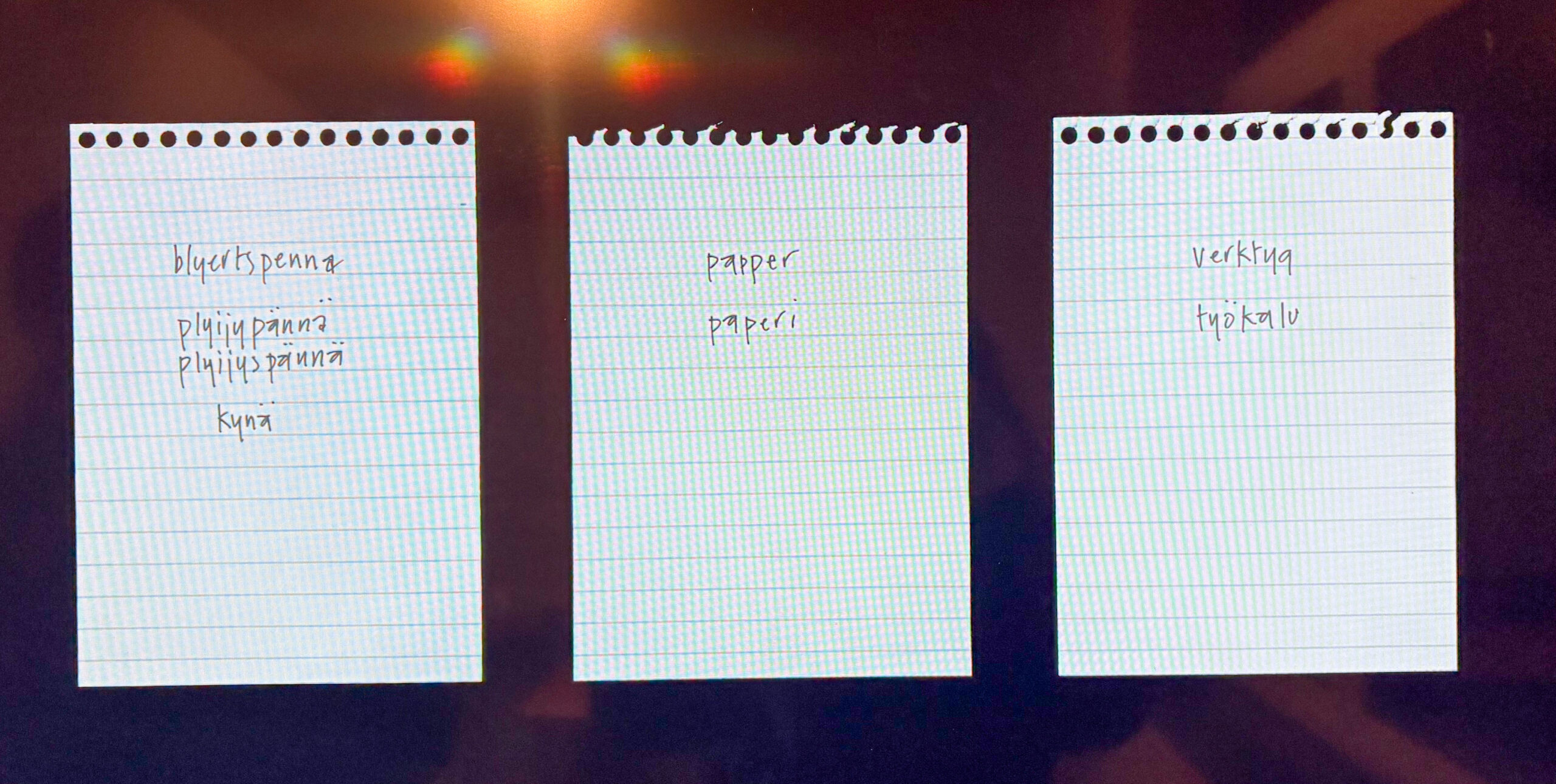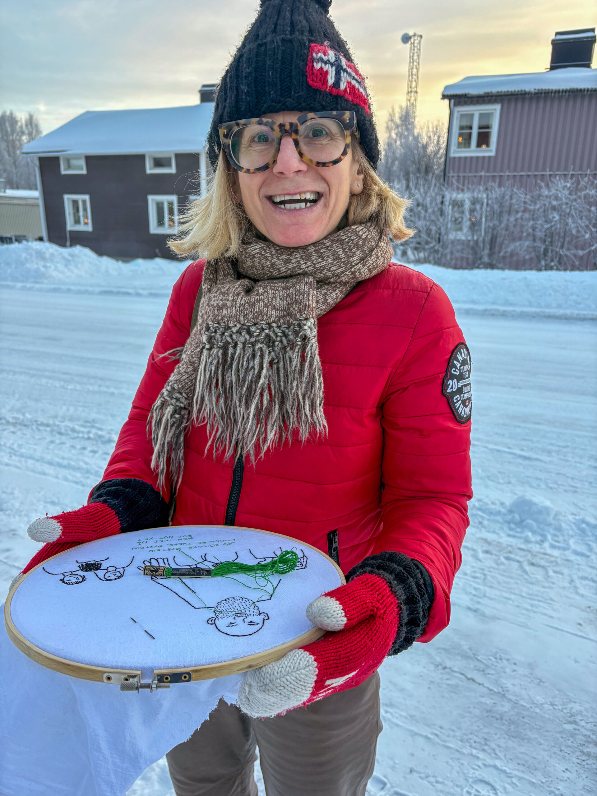 Det er fint å sitte og brodere sammen, jeg blir kjent med noen bibliotekarer fra Øvertorneå. Jeg spør om bibliotekarene kan meänkieli, og det kan de slett ikke, sier de, men etter noen timer med brodering begynner de å synge. Etter hvert viser det seg at de i hvert fall kan noen sanger på meänkieli, kanskje ble sangene lokket fram gjennom drømmene i broderiene?