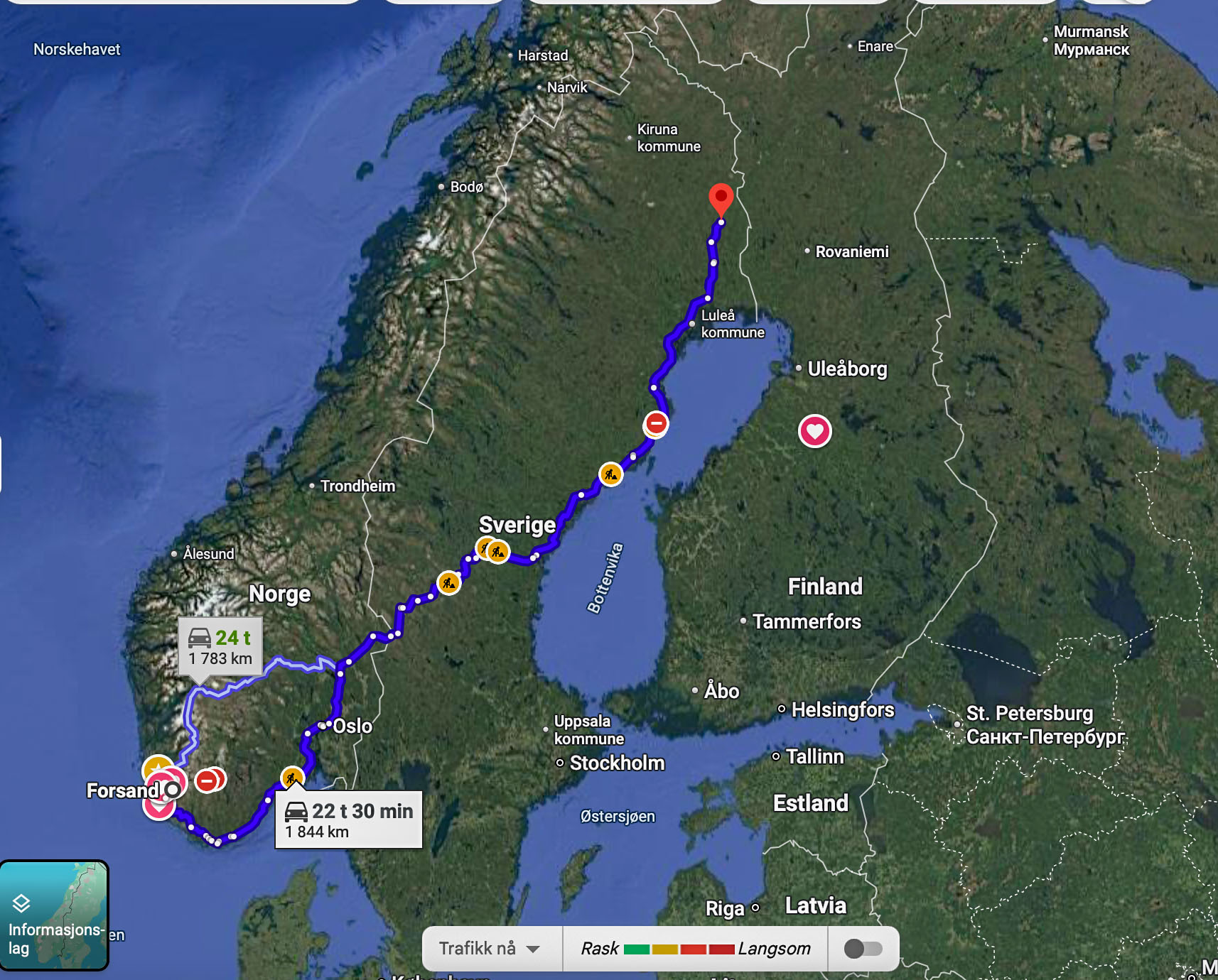 Det er ganske langt til Korpilombolo fra Forsand. Jeg kjørte ikke, men det er kronglete med fly og buss også. Heldigvis var det ikke snøstorm i år, så jeg kom både fram og tilbake til planlagt tid. (Skjermbilde Google maps)