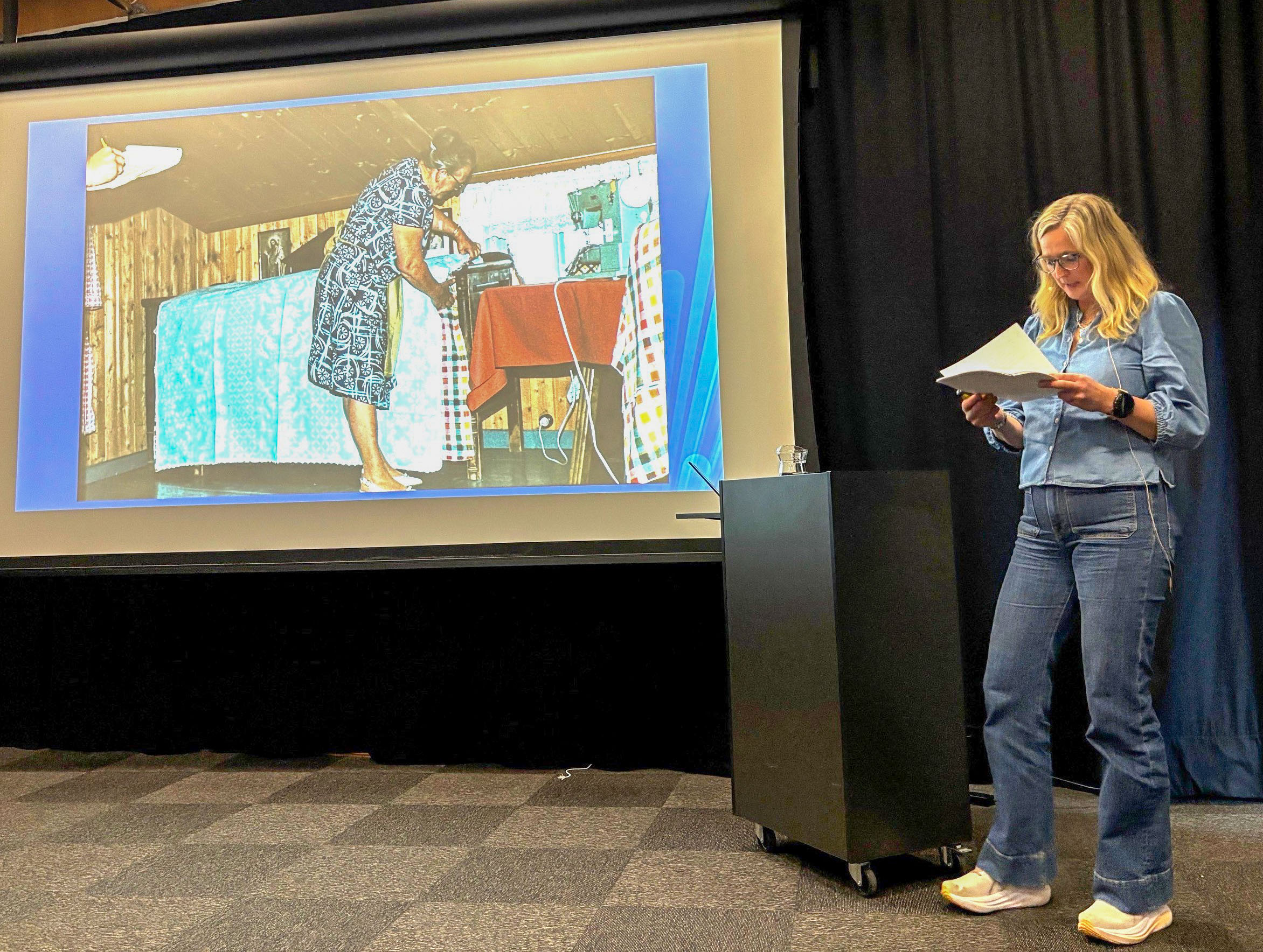 Lena Aarekol idet hun holder foredrag om Ida Tuomainen. Aarekol er direktør for Norges arktiske universitetsmuseum og akademi for kunstfag. (Foto: Bjørn Hildonen)