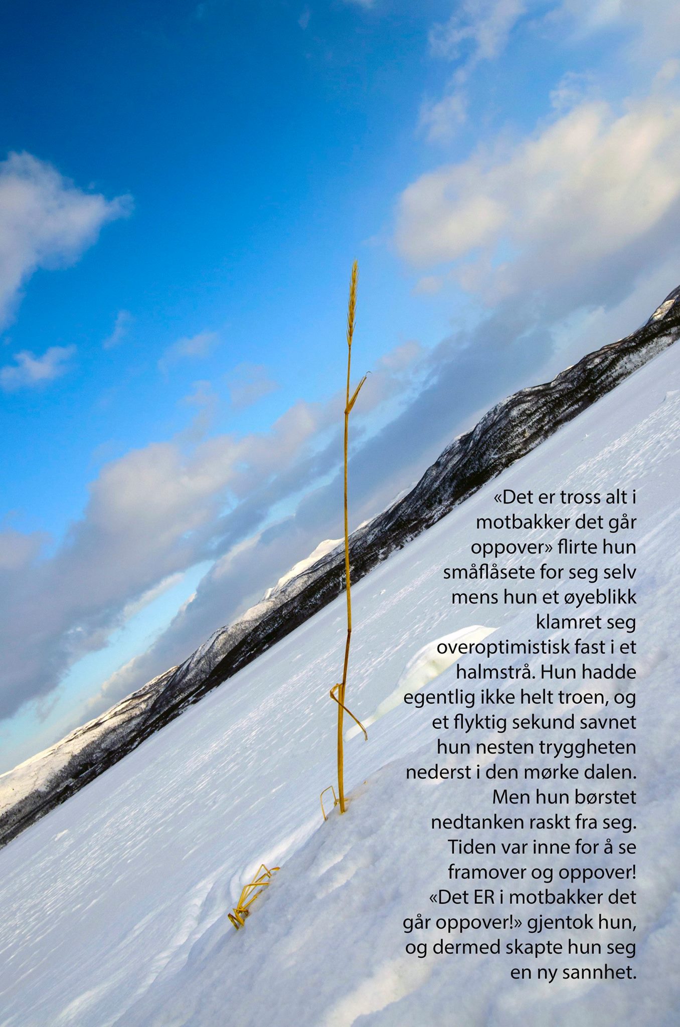 Ett av bildene hennes viser et vissent strå som stikker skjevt opp av snøen. Det er tatt i en vinkel som viser strået rett opp og ned, og bakken på skakke. En tekst dekorerer bildet, og her ser du bildet og teksten: