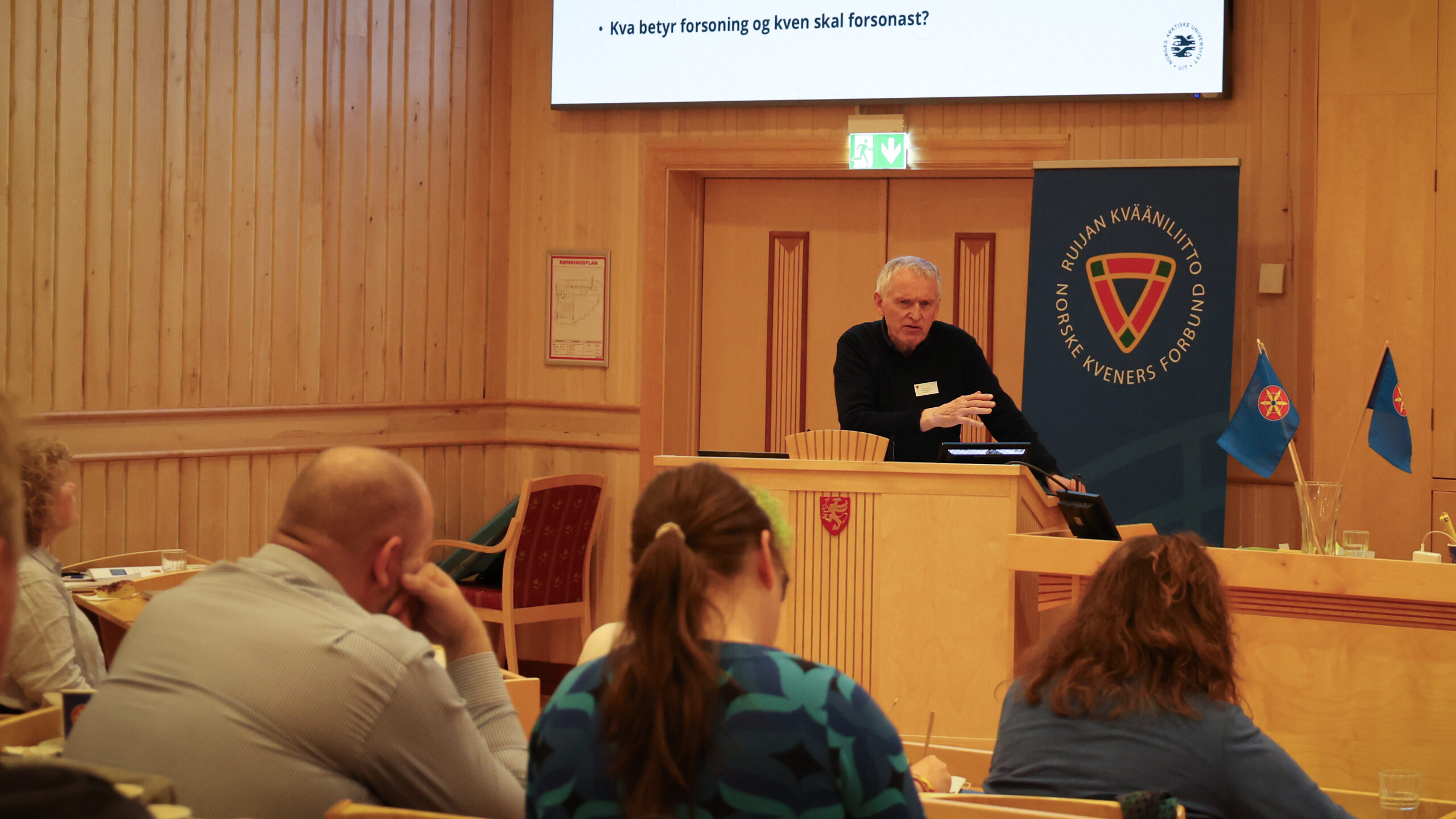 Torbjørn Svane Naimak på talerstolen under helgas landsmøte i Norske kveners forbund. (Kuva: Kjærstin Berntzen)