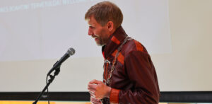 Ordfører Jo Inge Hesjevik sa varme ord da Kvensk institutt hadde 20-årsjubileum. • Sananjohtaaja Jo Inge Hesjevik sanoi lämpimii sannoi ko Kväänin institutila oli 20-vuotisjubileeumi. (Kuva: Maureen Bjerkan Olsen)