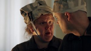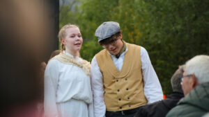 Det lokale skuespillertalentet Liam Steinsvik (til høyre) fra Nordreisa er med som statist. Her i aksjon sammen med Maren Andrea Westermann i forestillinga Satumaa (eventyrlandet) under årets Kyläpeli. (Kuva: Pål Vegard Eriksen)