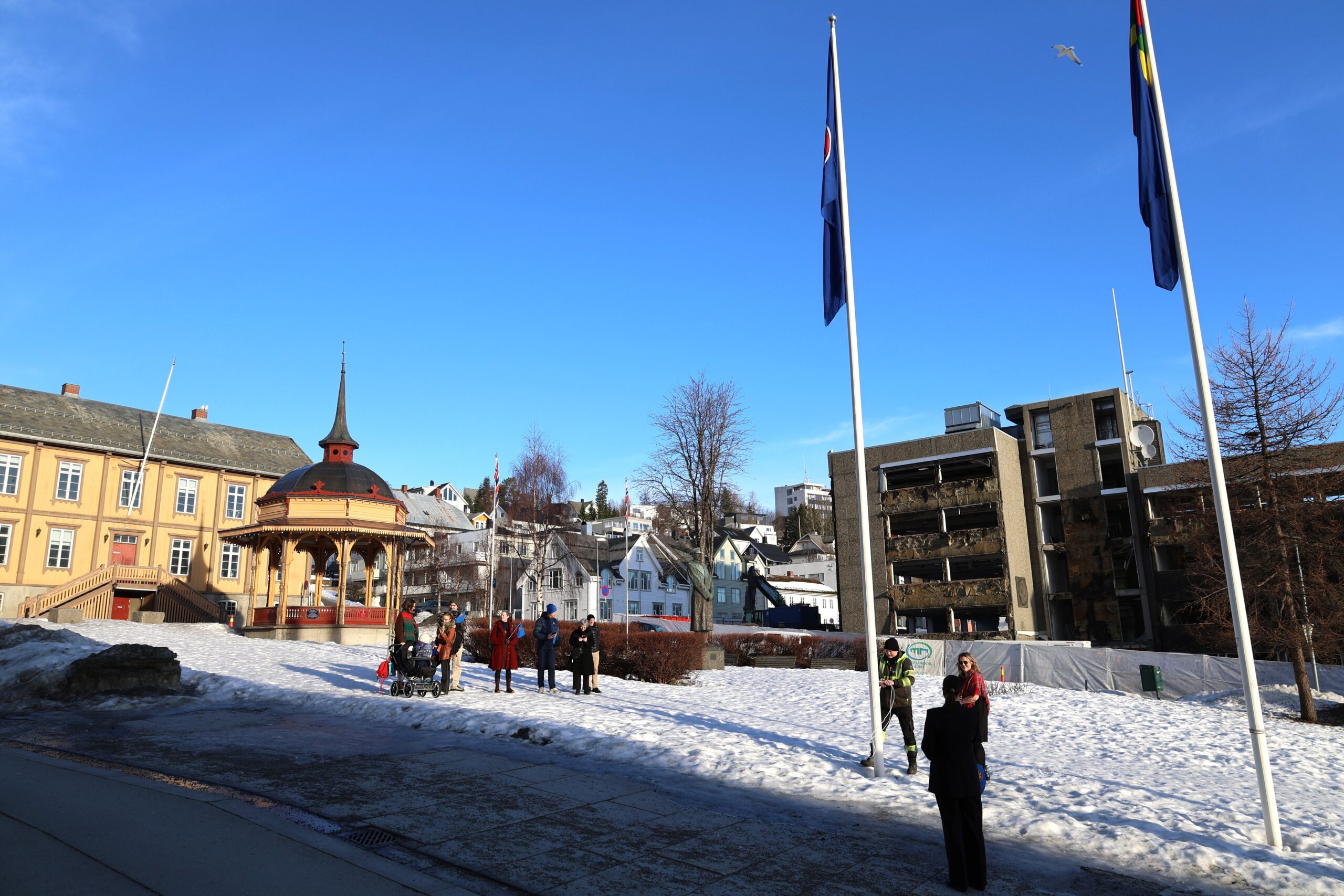 Solskinn og påskestemning da kvenflagget ble heist utenfor Tromsø rådhus mandag morgen. (Kuva: Kjærstin Berntzen)