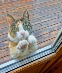 Katten heter Pusi og var luta lei av å være ute. Hun fant verandadøra og lot labbene spinne på glassruta.