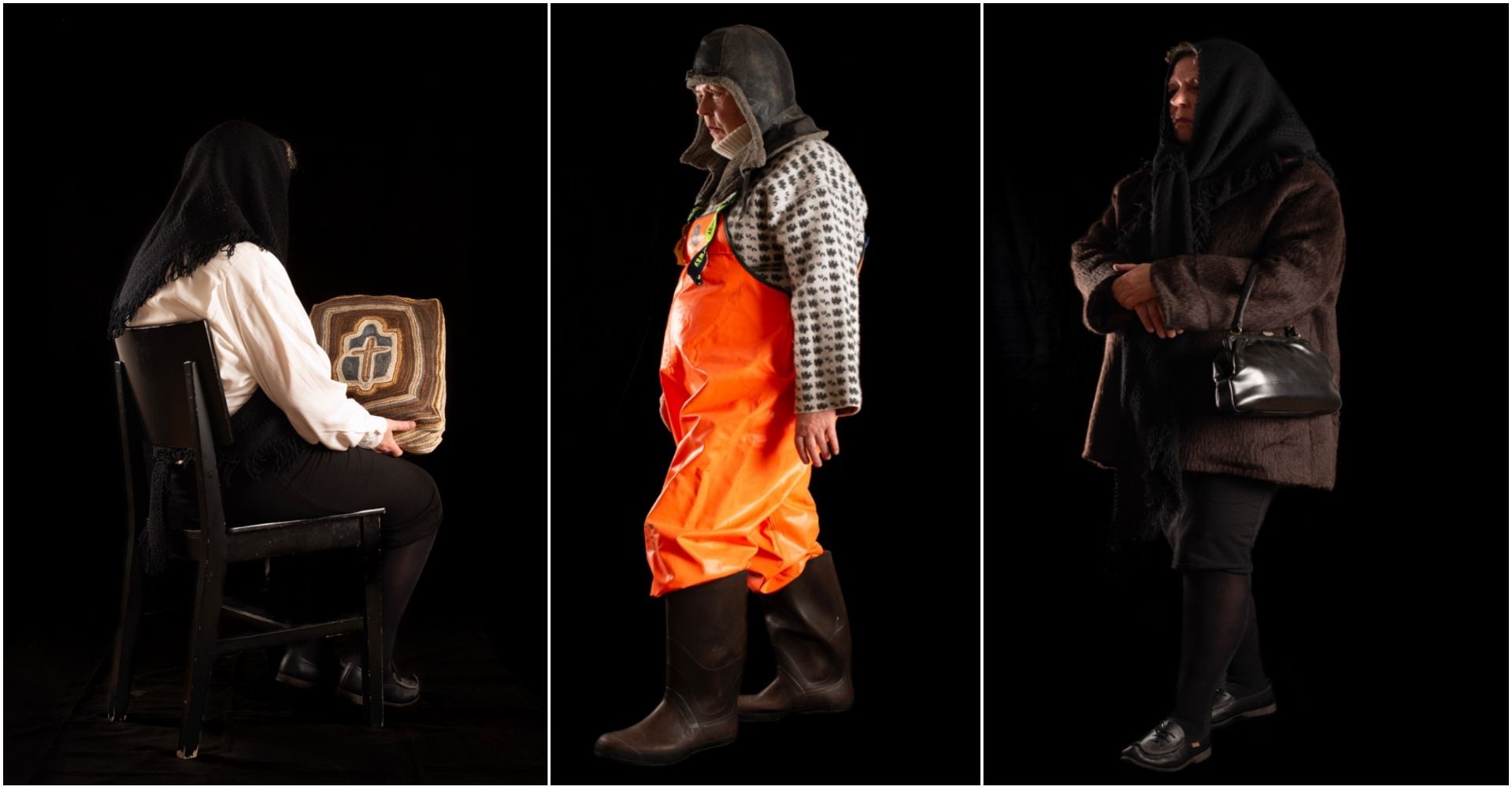 Fotografier fra katalogen til utstillingen Fornorska, hvor Liv Bangsund har kledd seg som sin mormor, bestefar og bestemor. (Alle foto: Mihály Stefanovicz)