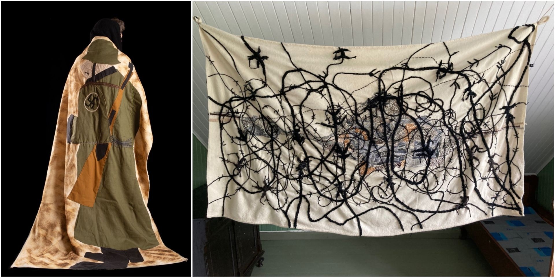 To gjenbrukte, broderte ulltepper i utstillingen. Minner fra andre verdenskrig til venstre, og til høyre en illustrasjon av et nedbrent hus på Elvenes i Oksfjorden. (Kuva: Mihály Stefanovicz)