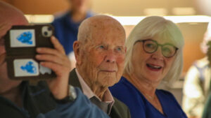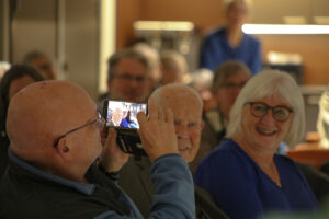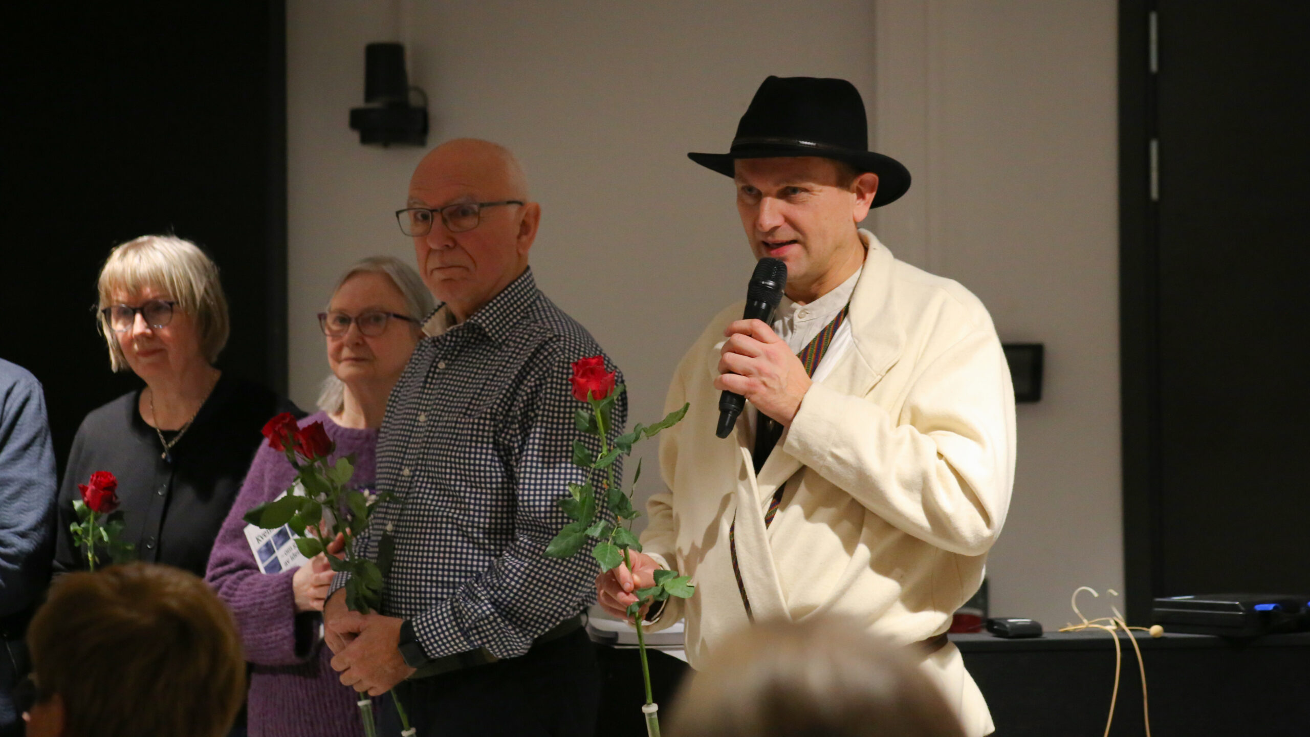 Etter at alle bidragsytere hadde fått en rosende takk, nyttet Bernt Isaksen høvet til å gratulere publikummer og kvenforbudets eldste medlem, Atle Andreas Isaksen, med 99-årsdagen han nylig hadde. (Kuva: Pål Vegard Eriksen)