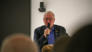 Leder i Tromsø kvenforening, Bernt Isaksen, ønsket velkommen. Den lokale kvenforeninga var med på arrangørsiden ettersom lanseringen var satt til nettopp Tromsø. (Kuva: Pål Vegard Eriksen)