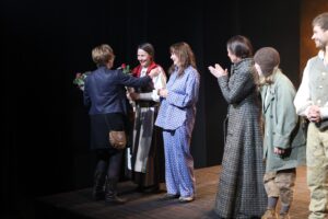 Inger Birkelund deler ut blomster til Ingeborg Arvola etter turnépremieren på Halti kulturscene. (Kuva: Kjærstin Berntzen)