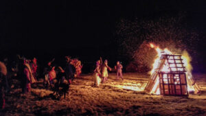 Nyttårskaller, eller nyttårsnisser som det heter lokalt, rundt bålet i Olmavankka/Manndalen i 2016. (Kuva: Pål Vegard Eriksen)